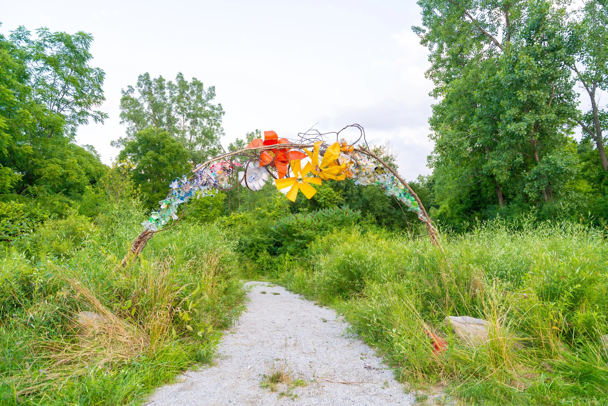 The Eliza Howell Park Eco-Artist Residency is a public art initiative in Detroit that addresses climate crises like water pollution through the lens of spatial equity and public art. Throughout the spring and summer, Detroit-based artist-in-residence, Halima Cassells, led three workshops where participants collaborated to rescue materials from the Rouge River, embarking on the transformation of trash into treasure for an upcycled art installation at Eliza Howell Park. These workshops allowed individuals to contribute to the creation of the sculpture, which was constructed from repurposed materials and now stands as an archway at the trailhead leading to the Rouge River, serving as a gateway to the woodland nature trail. The Ecology Center provided valuable insights during the workshops about microplastics and sustainable practices, reinforcing the project's commitment to environmental stewardship. This collaborative effort resulted in an artwork inspired by wildflowers and the concept of nature's abundance, standing as a reflection of the park's natural beauty and a symbol of our shared commitment to environmental stewardship and addressing climate crises.